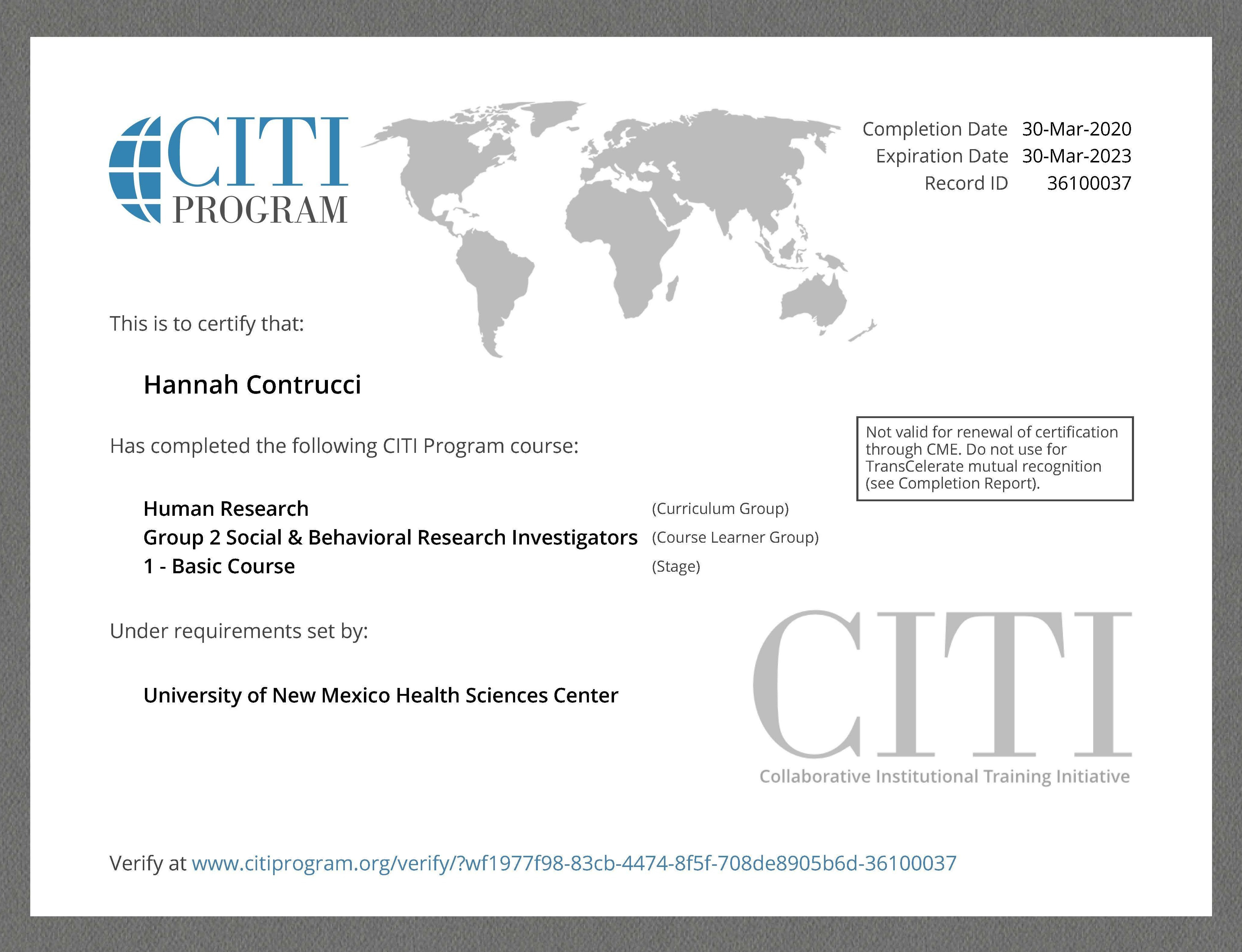 CITI Social and Behavioral Research Investigators Certificate